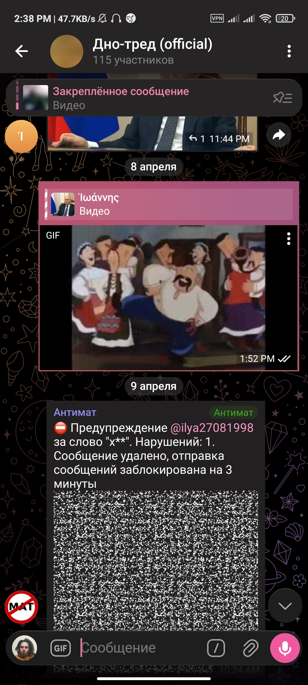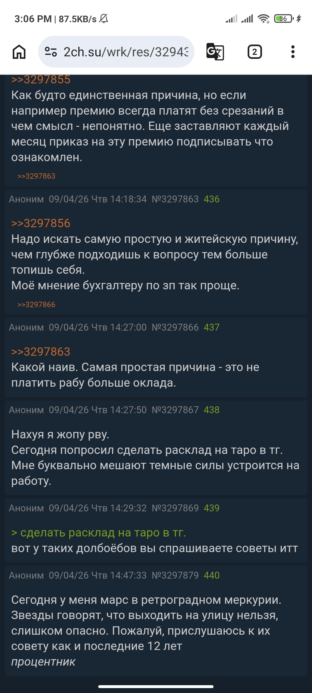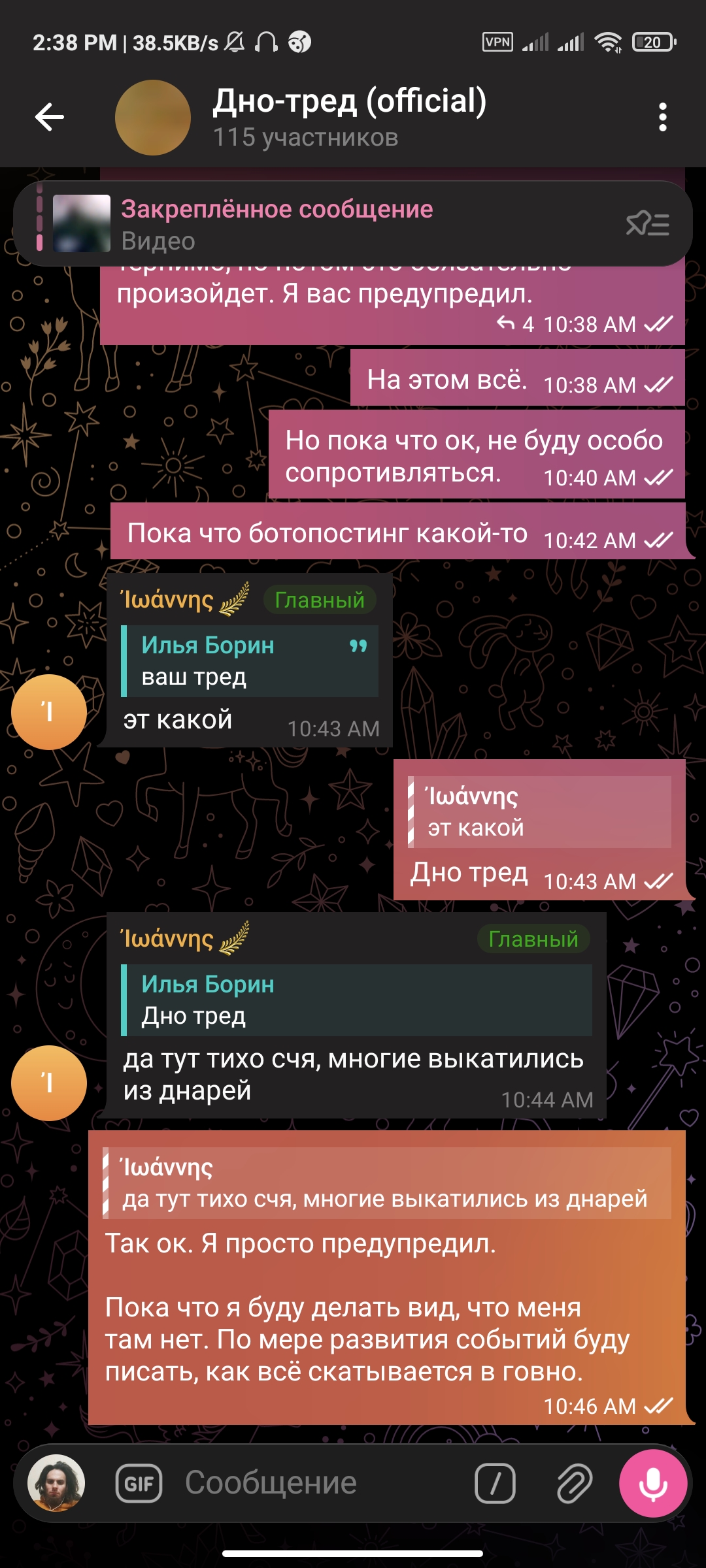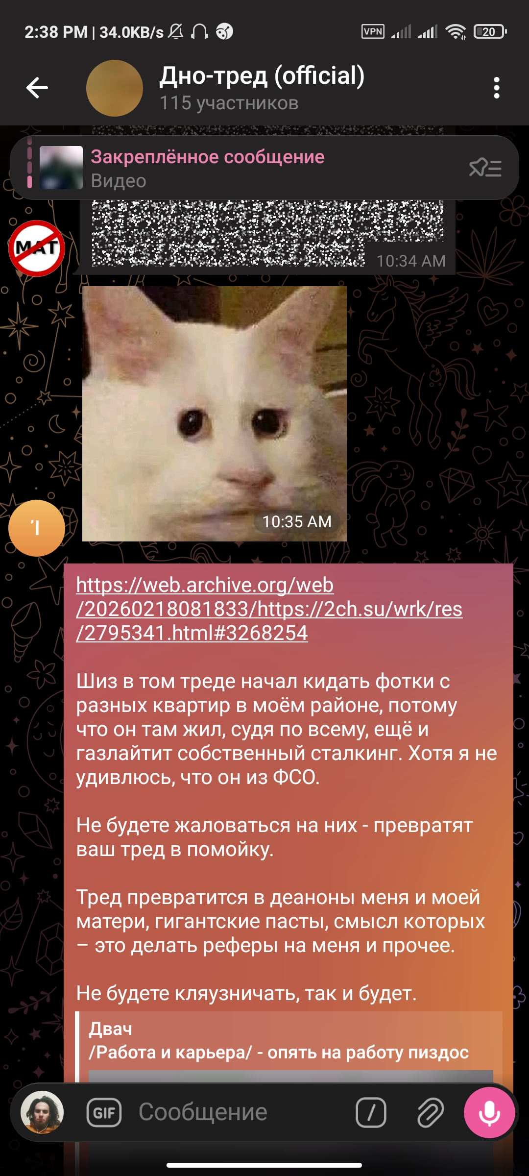 2:44 После записи голосовухи чекнул пиздос-тред и начал читать о том, в каких случаях госпитализация может быть не добровольная. Чипхолдеры сделали сильное желание отрезать себе член, затем быстро прекратили. Типы в пиздос-треде троллят, но я принял решение свалить с борды после акта беспредела модеров в мою сторону, поэтому постить туда больше не буду.
